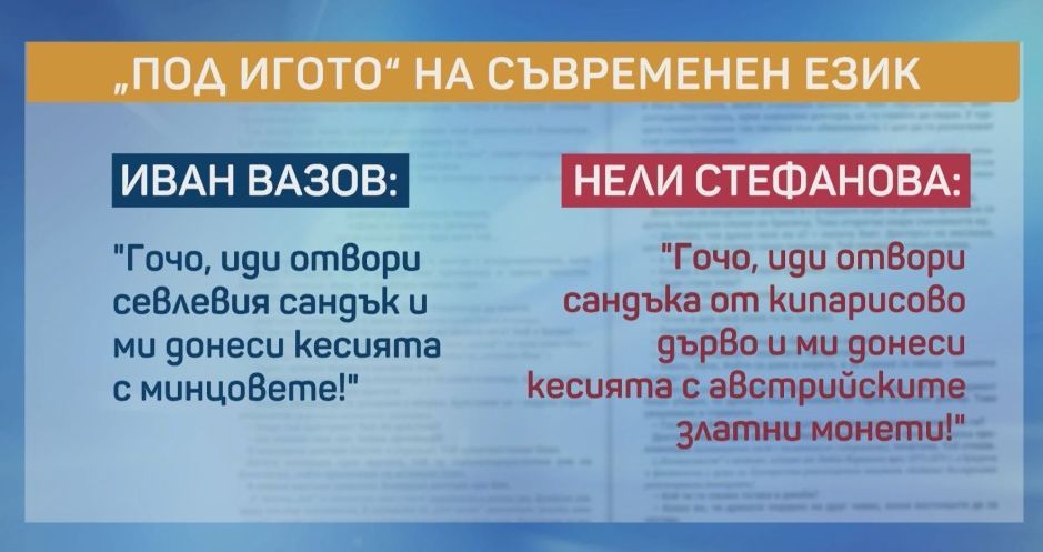 Издание на "Под игото" на патриарха на българската литература Иван Вазов, "преведено" на съвременен български език, разбуни духовете в социалните мрежи. В него архаични думи са заменени с такива, които използваме в езика днес. В изданието са променени над 6000 думи и изречения, които според авторката Нели Стефанова са неразбираеми за младежите.
