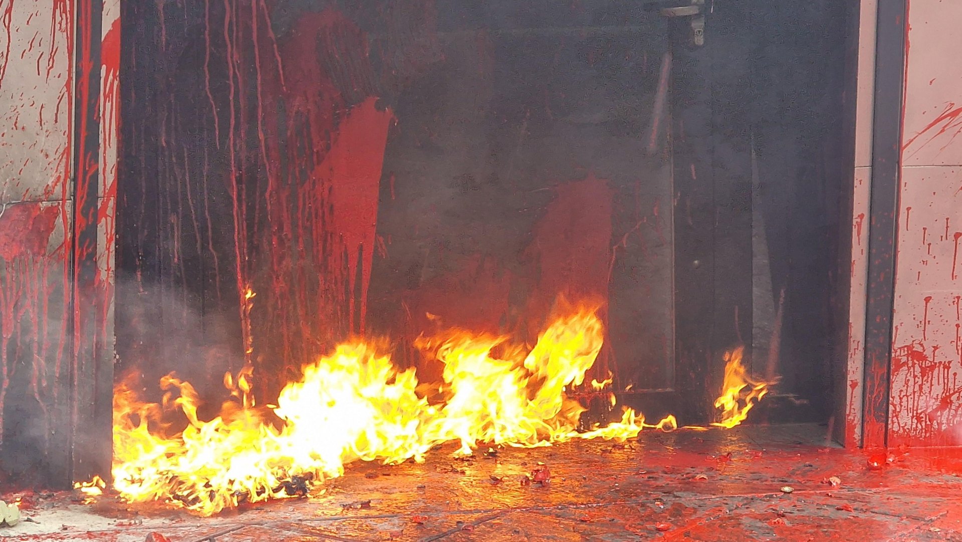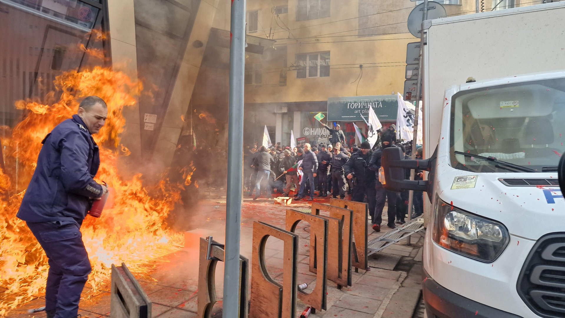 Напрежение възникна по-рано днес пред зданието на ул. "Раковски", след като протестиращи срещу еврото, организирани от "Възраждане" хвърляха червена боя и бомбички по нея. Вратата на сградата беше запалена, протестиращите хвърляха и яйца. Шестима души са арестувани, 10 полицаи пострадаха при възникналото напрежение по време на протеста, организирана от "Възраждане", съобщиха от СДВР.Категорично осъждаме поругаването на сградата на Европейския парламент и Европейската комисия в България. Това написаха от Министерския съвет на страницата си във Фейсбук.