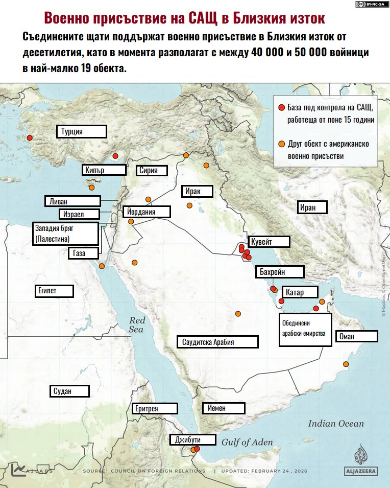 "Ал Джазира" публикува карта с базите на САЩ в Близкия Изток. Според тях Съединените щати поддържат военно присъствие в Близкия изток от десетилетия, като в момента разполагат с между 40 000 и 50 000 войници в най-малко 19 обекта.